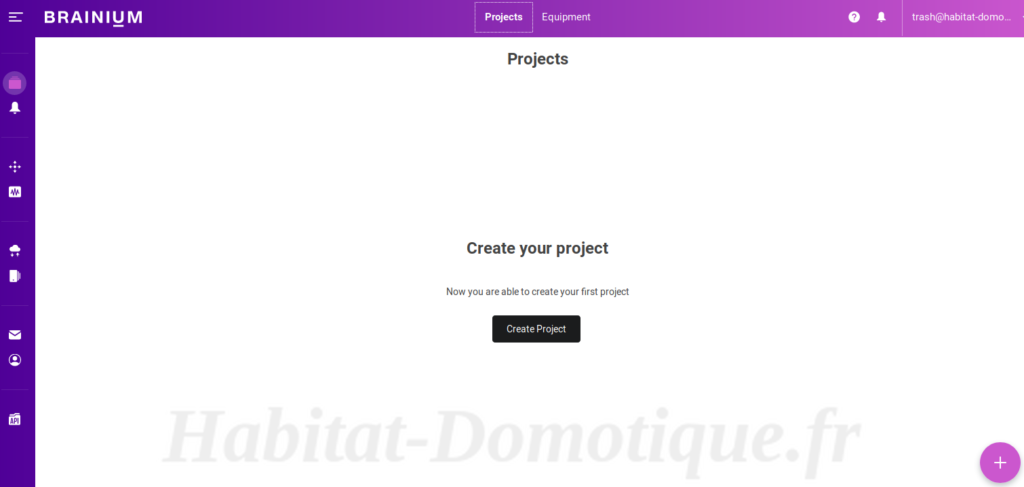 Pour créer un projet, allez sur le portail Brainium et ouvrez l’onglet « Projets ». Cliquez ensuite sur l’icône « + » dans le coin inférieur droit pour afficher le nom du projet.
