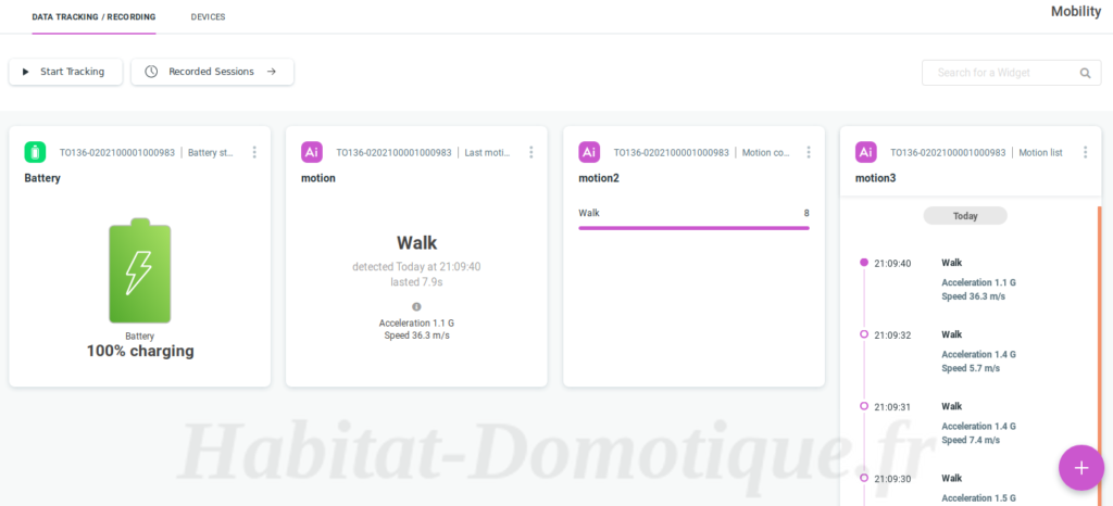 Pour cet exemple, j’ai créé 4 widgets. La première pour suivre la batterie et les trois autres pour suivre les mouvements.